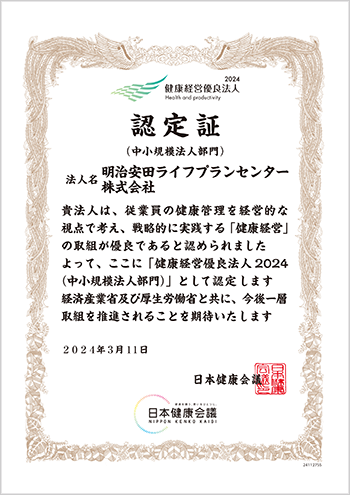 当社は、明治安田生命健康保険組合を通じて健康企業宣言を行ない、継続して健康経営および健康づくりの取組みを積極的に実施しております。