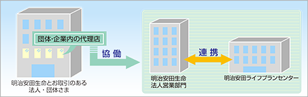 損害保険の代理店業務を、当社と明治安田生命総合法人営業部門・公法人営業部門とが各々の特徴を生かせる分野で分担し、法人・団体さまにとって最適な制度運営スキームをご提供します。